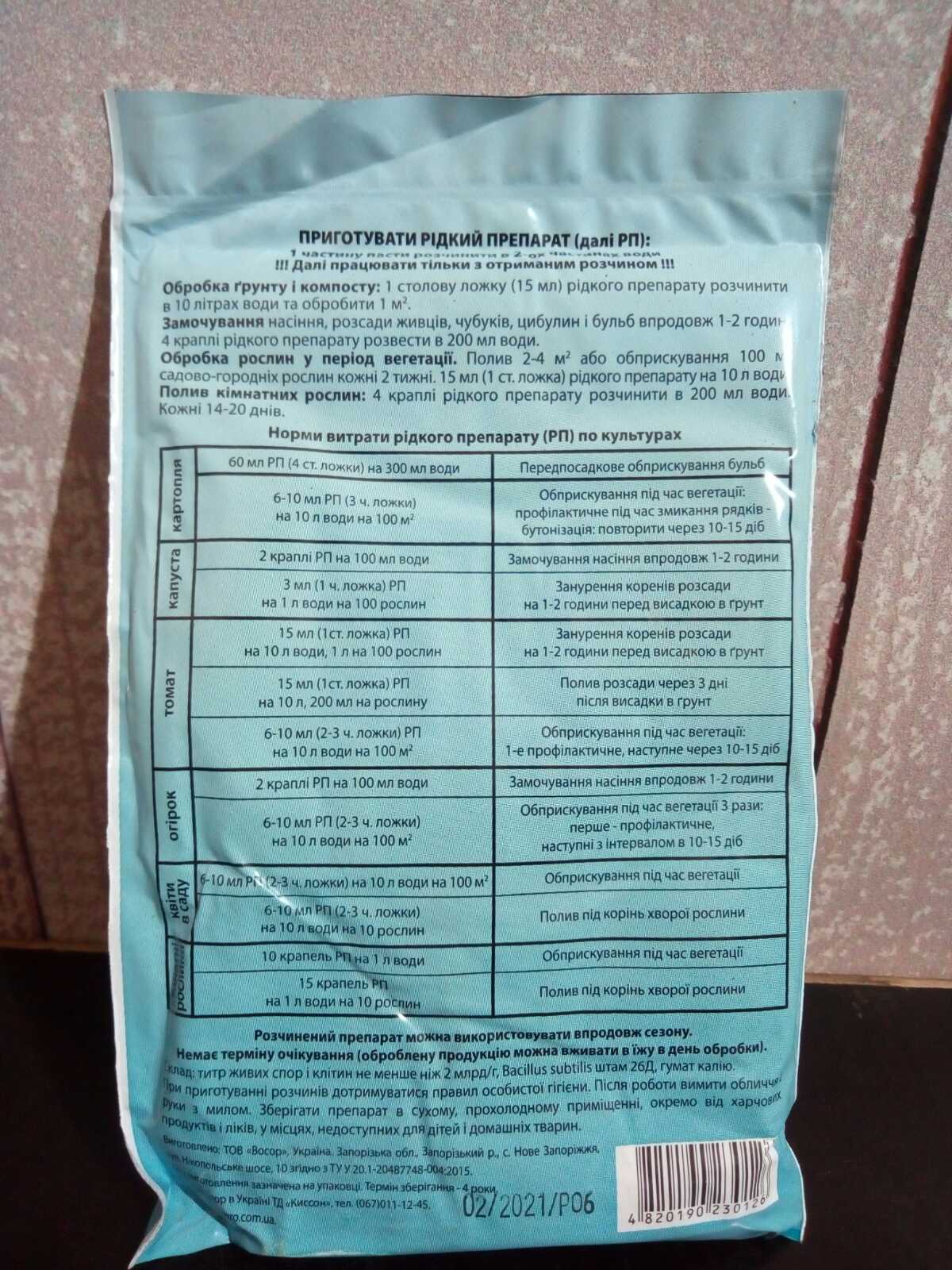 Один пакет Фитоспорина (200г.) рассчитан на 600 литров рабочего раствора, чего хватит для обработки 1-6 соток. Нет срока ожидания — так как обработанную продукцию можно употреблять в пищу в день обработки! Аналогов по концентрации и качеству нет.