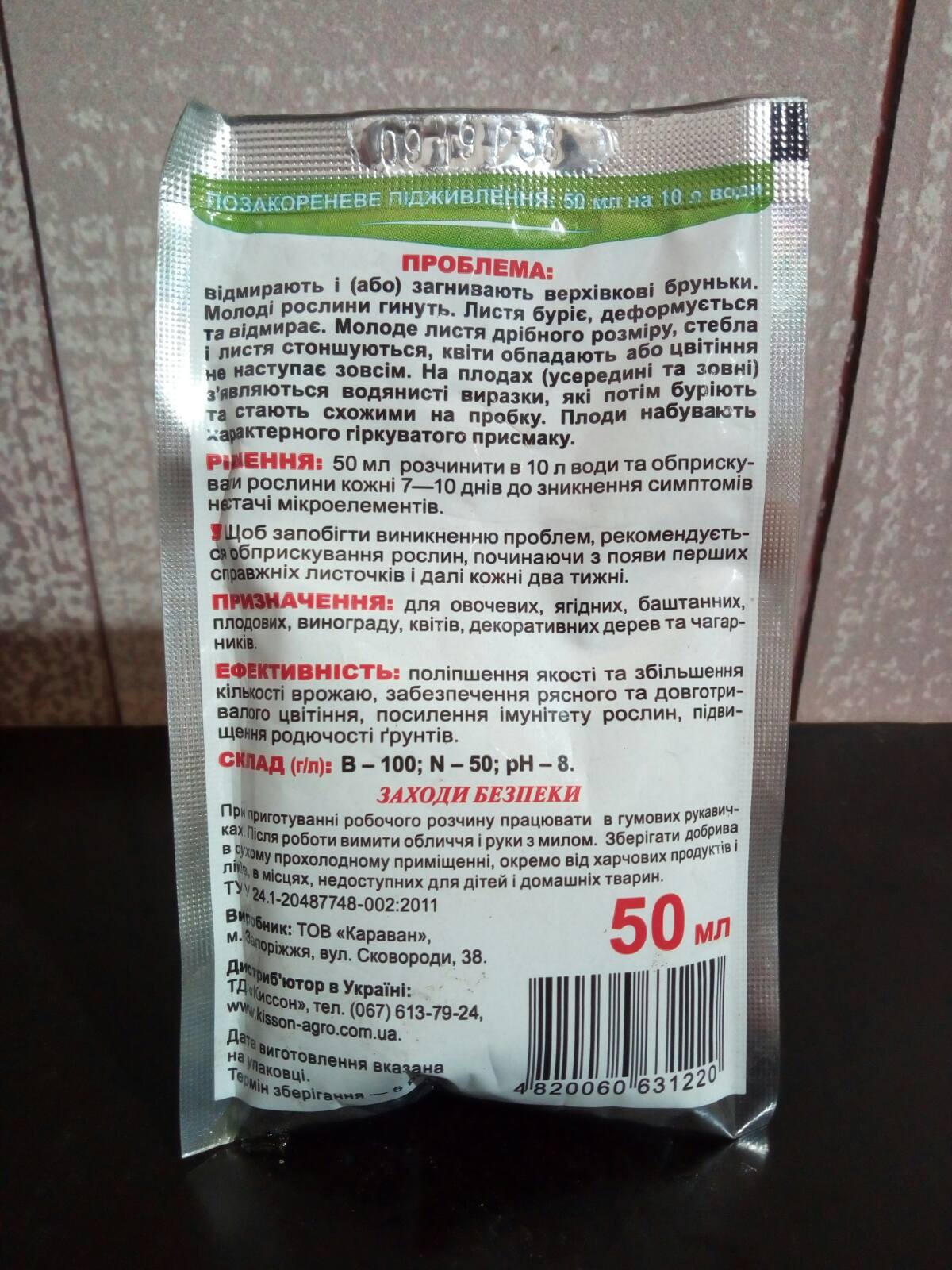 Хелатин Бор 50 мл — високоефективне екологічно чисте мікродобриво у біологічно активній формі на основі хелатів і мікроелементів, призначене для позакореневого підживлення рослин.