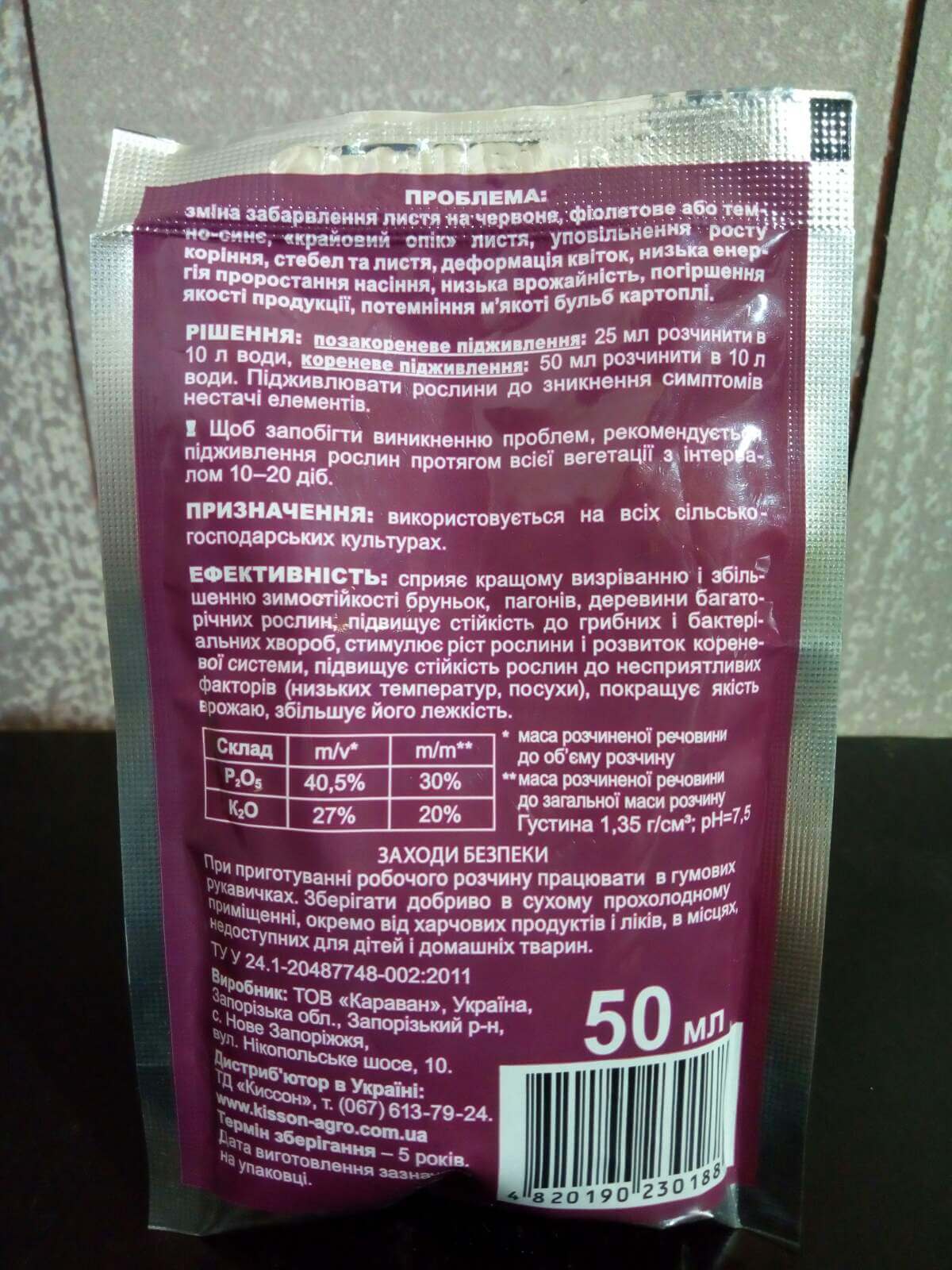 50 мл добрива розчинити в 10 літрах води. Поливати під корінь. -